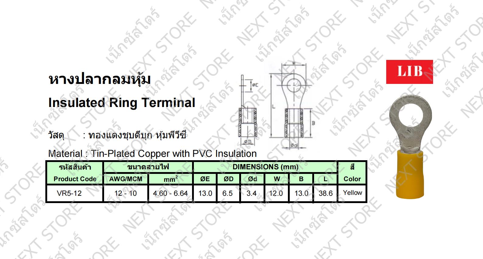 หางปลากลมหุ้มฉนวนพีวีซี VR5-12 สีเหลือง สำหรับสายไฟ 4.0 - 6.0 sq.mm. Brand : LIB Material : ทองแดงชุบดีบุก หุ้มพีวีซี ขนาดบรรจุ : 100 ชิ้น / 1 ห่อ