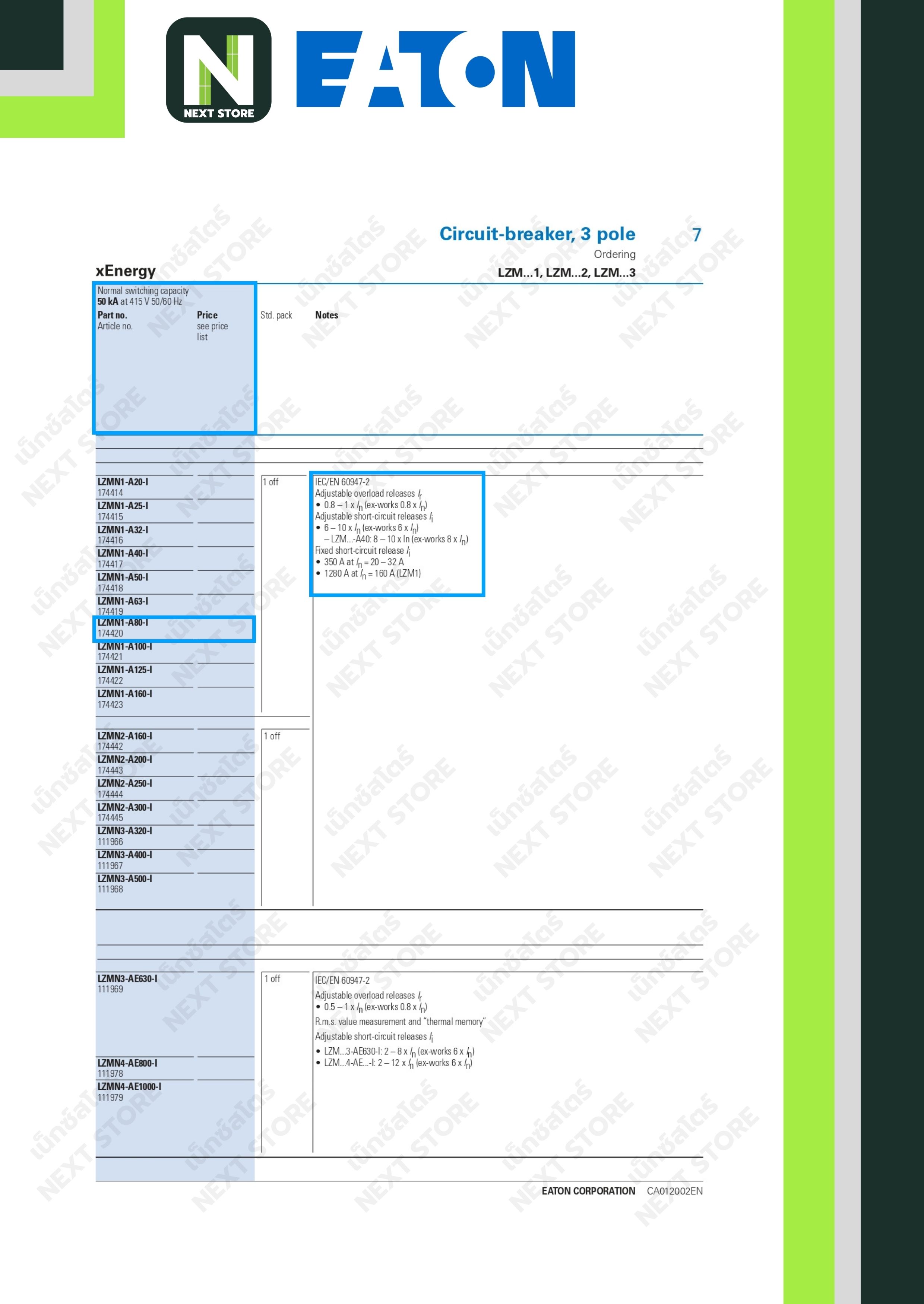 เบรกเกอร์ MCCB 3P 80AT/160AF 50kA at 415V รุ่น LZMN1-A80 / Circuit Breaker MCCB 3P