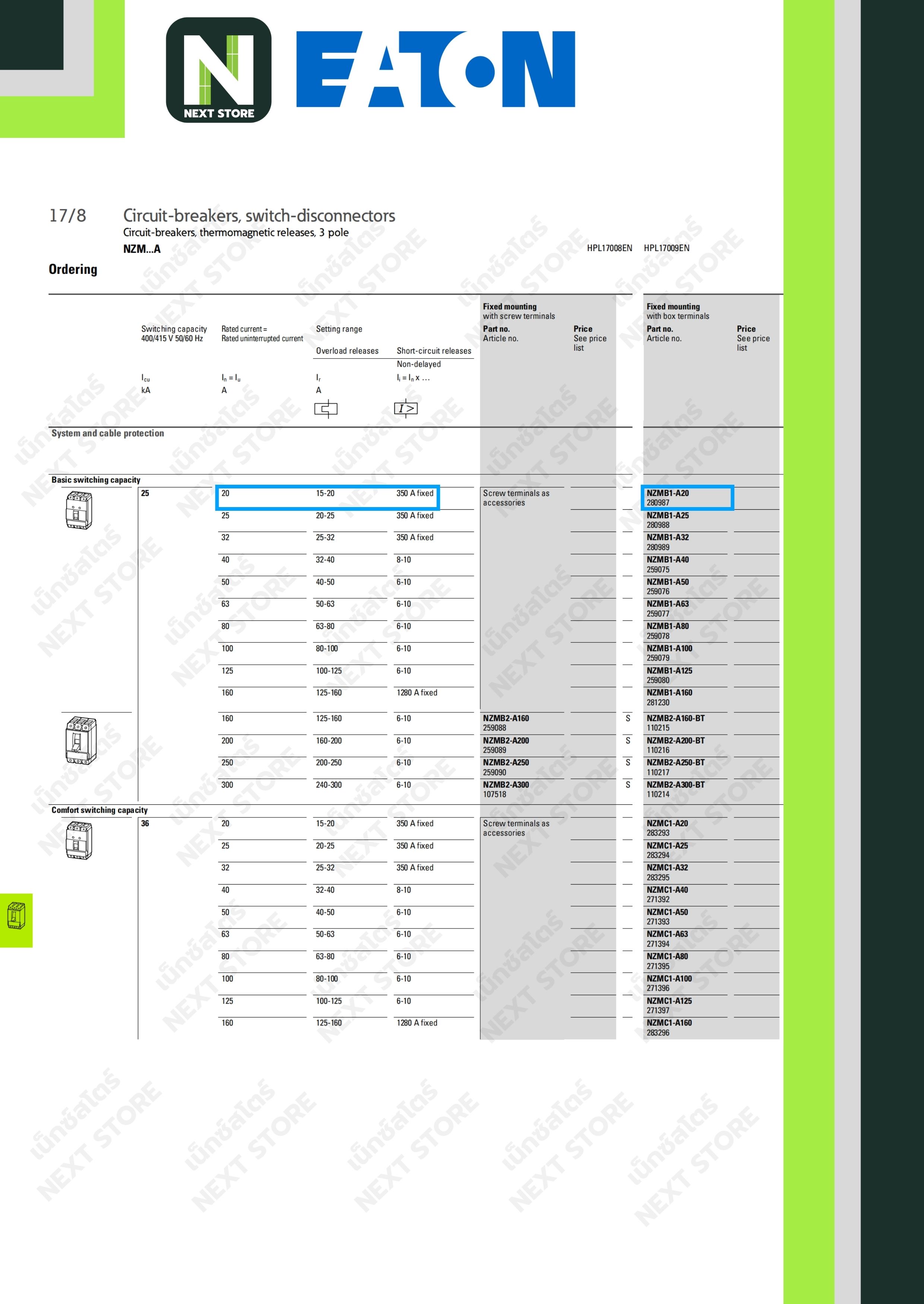 รุ่น : NZMB1-A20-AS Brand : EATON Poles: 3P Rated Current (AT): 20A Frame Size (AF): 160A Breaking Capacity (Icu):25kA at 415V ขนาดบรรจุ : 1 ตัว