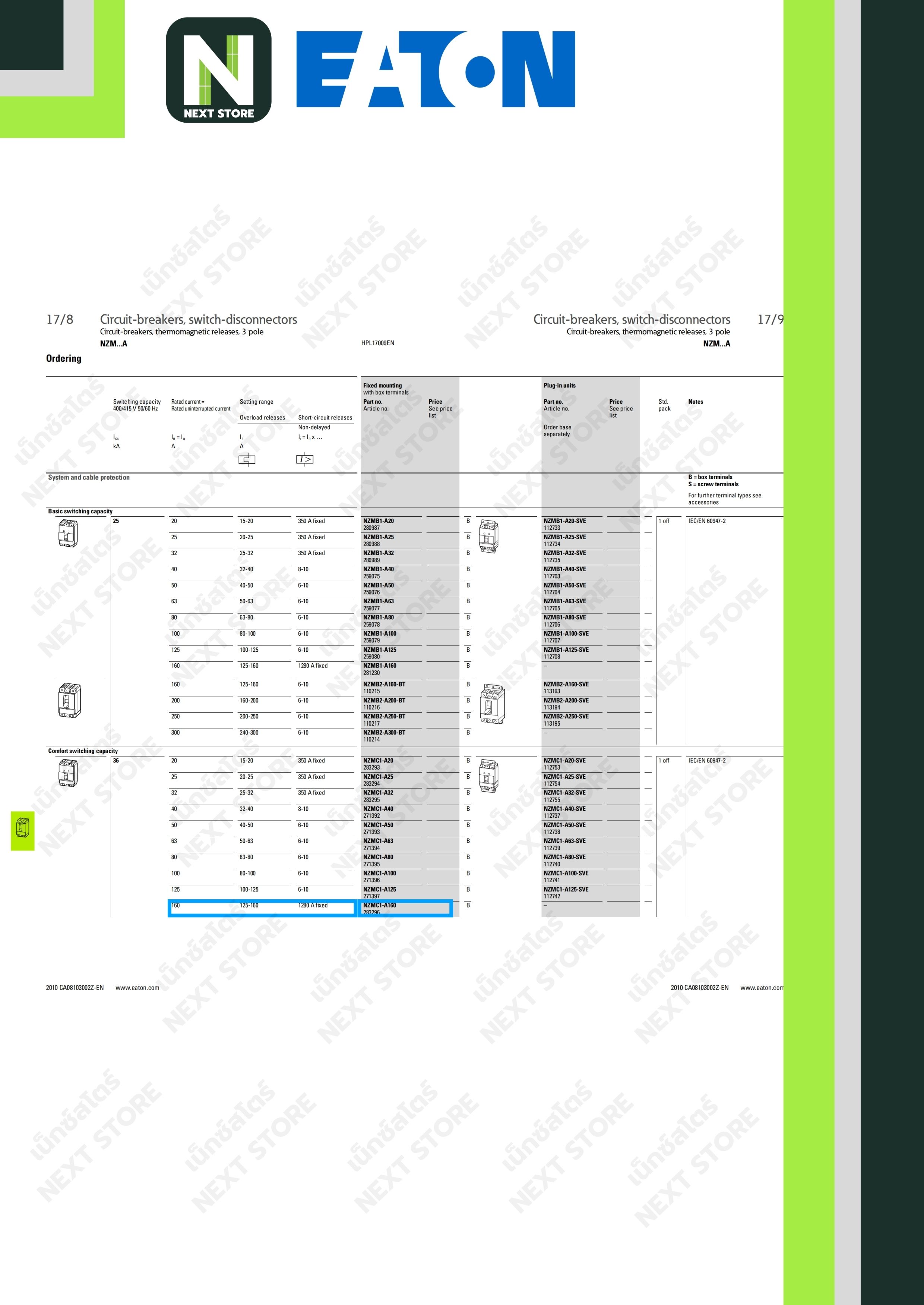 รุ่น : NZMC1-A160-AS Brand : EATON Poles: 3P Rated Current (AT): 160A Frame Size (AF): 160A Breaking Capacity (Icu):36kA at 415V ขนาดบรรจุ : 1 ตัว
