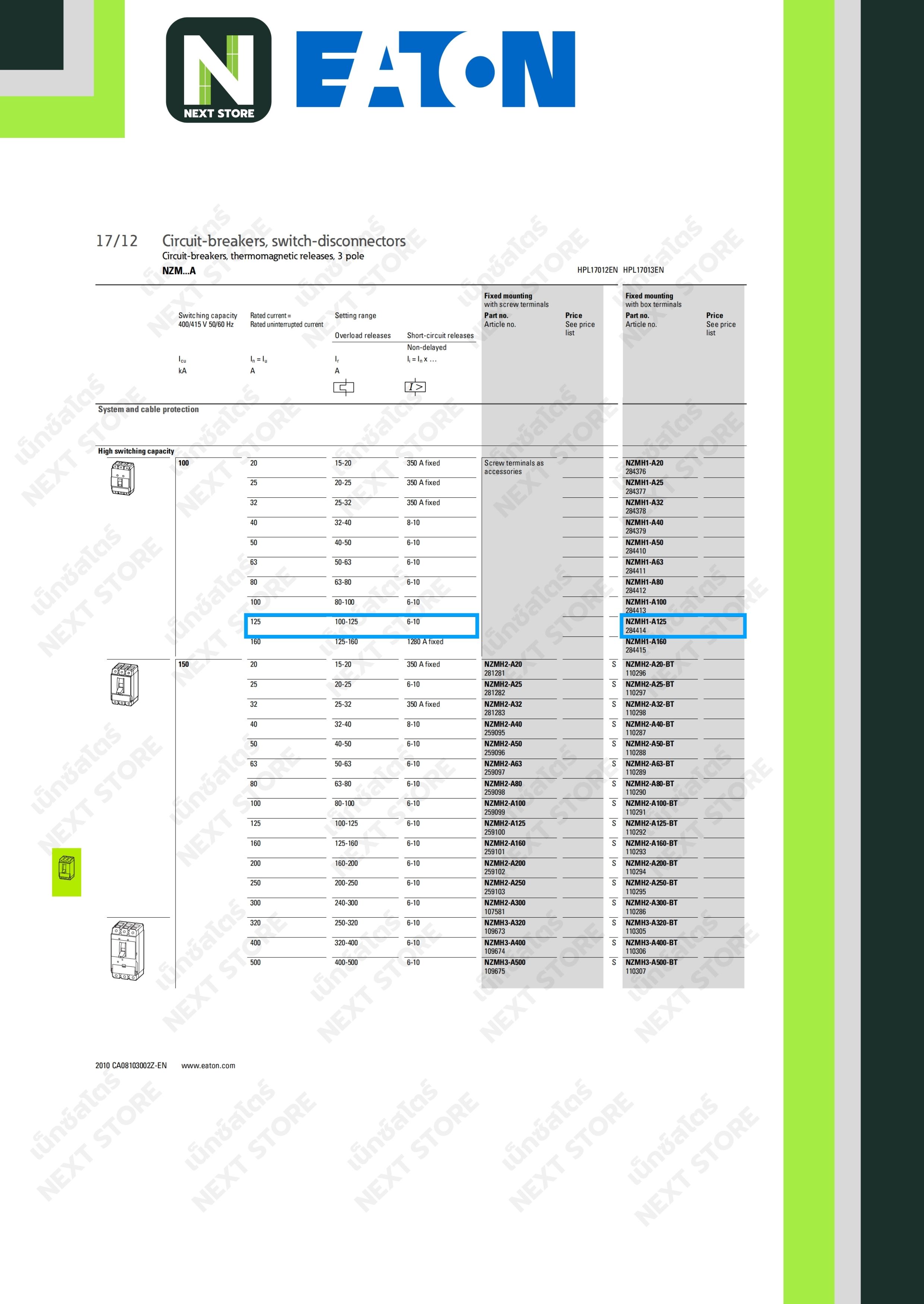 เบรกเกอร์ MCCB 3P 100-125AT/160AF 100kA at 415V รุ่น NZMH1-A125 / Circuit Breaker MCCB 3P
