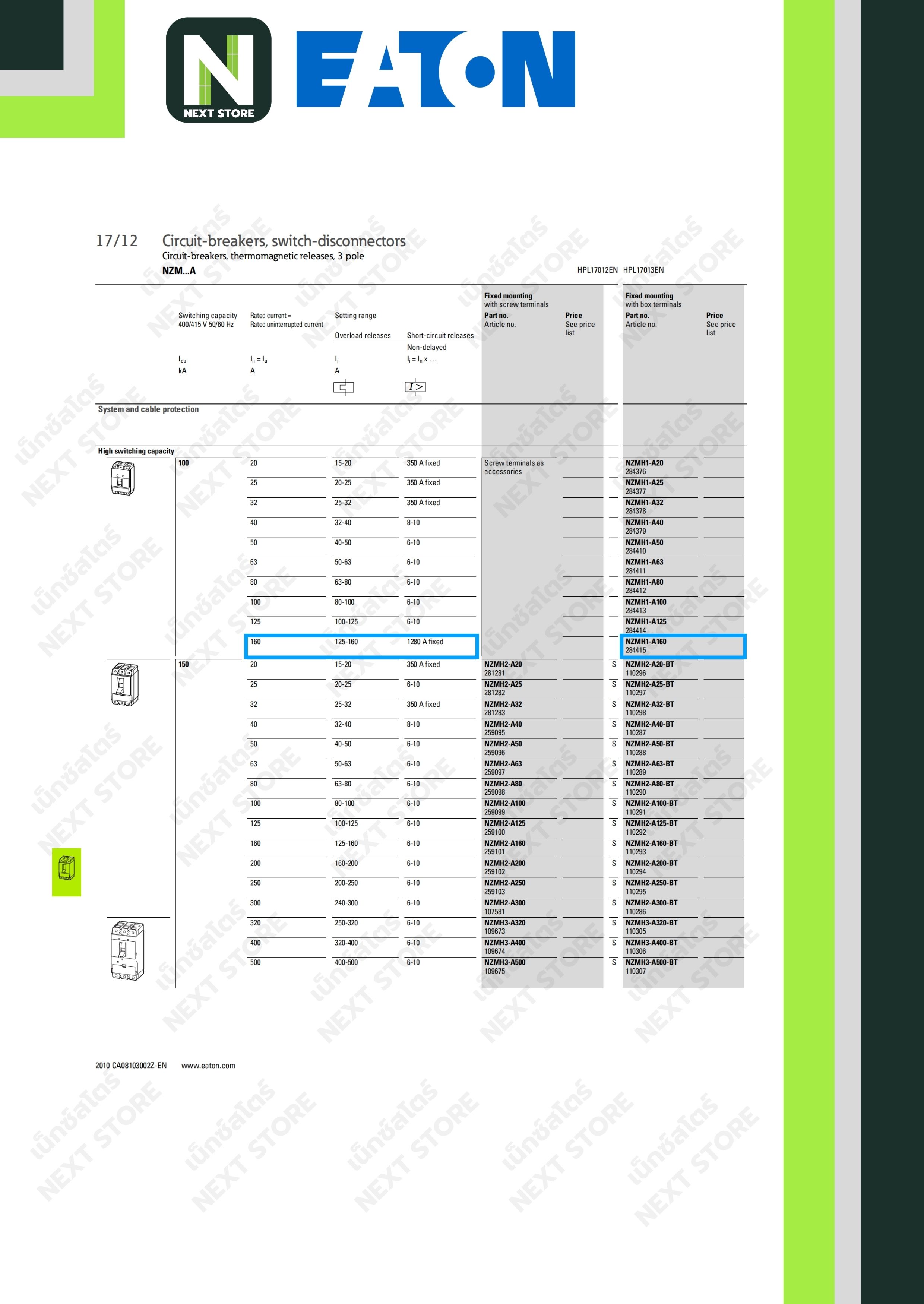 เบรกเกอร์ MCCB 3P 125-160AT/160AF 100kA at 415V รุ่น NZMH1-A160 / Circuit Breaker MCCB 3P