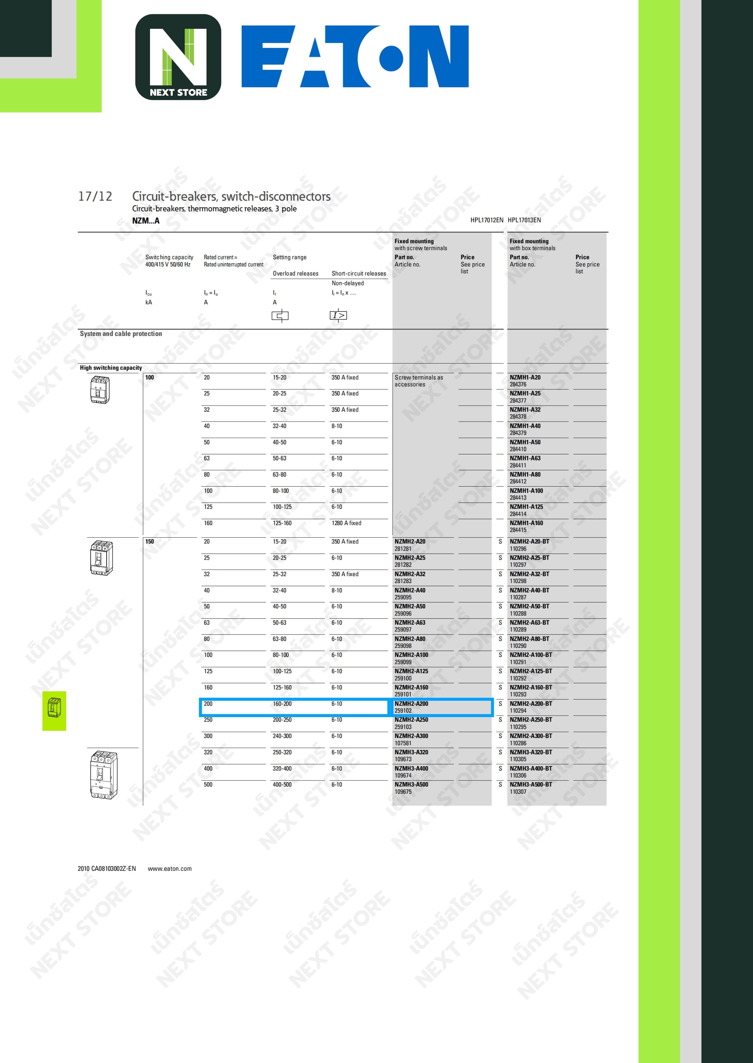 เบรกเกอร์ MCCB 3P 200AT/300AF 150kA at 415V รุ่น NZMH2-A200 / Circuit Breaker MCCB 3P